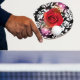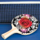 黒のダマスク柄の背景に赤いバラがアクセントになっています。