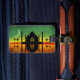 Orient night illustration: En moské och handflatan silhouette på natten himlar med måne och stjärnor reflekterande på vatten.