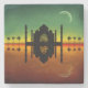 Orient night illustration: En moské och handflatan silhouette på natten himlar med måne och stjärnor reflekterande på vatten.