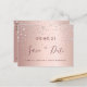 Ett feminin och glamoröst Spara datumkortet i 100 födelsedagsfester. En feminin rosa, ro guld faux metallisk tittar bakgrund dekorerad med faux ro guld diamant sprinkle. Mallar för ett datum och din text. Mörk ro guld färgad brev. Texten: Spara datumet skrivs med ett stort trendig-handskript i stil. Baksida: ro guld bakgrund och diamanter. Mallar för information om party. Svart text.