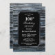 En rustik silver-borderblått och grått-lada-middag på 100:e födelsedag med den vita texten markerad på en svart bakgrund.