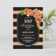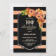Svart och faux glitter-korall stripe blommigt 100-årsmiddagsinbjudan.
