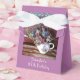 Vilken underbar, personlig-partiets favoritbox för en hundraårsjubileum eller annat tillfälle. På framsidan, Namn och Händelsenamn i vitt på lilans bakgrund. På baksidan "Tack för att fira med oss" (eller din anpassningsbar) och valfritt datum. Dekorerad med originalfotografiet av en vintage tekanna fylld med vackra blommor. En favoritruta för elegant och chic på födelsedagen. Alla Höger förbehållna © 2015 Alan & Marcia Socolik.