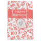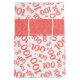 This modern design is a coral and white random number pattern with a coral milestone number 100 repeated in varied sizes and angles printed on a white background. There is a banner with, "Happy Birthday," and a printed white gift tag with a name and message; both have text templates. You can easily personalize the text with your own words, name, initial or monogram.