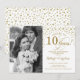 10-års bröllopsdag inbjudan med foto. Elegant design i guld och vitt med skrivstil och konfetti. Kan anpassas för alla år av äktenskap. Skål för 10 år!