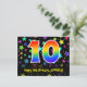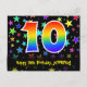 Framsidan av denna spännande, roliga och färgglada födelsedagsteman postkort design har en stor siffra "10" med ett regnbågsspektrum gradient mönster, tillsammans med meddelandet "Grattis på 10-årsdagen", och ett personligt mottagarnamn. Framsidan har dessutom ett färgglatt och livfullt stjärnformigt bakgrundsmönster. Baksidan har ett anpassat födelsedagsmeddelande, eller kan kanske rensas och lämnas tomt om ett meddelande ska skrivas för hand istället. Ett personligt födelsedagskort som detta kan vara ett roligt sätt att erkänna någon på deras tionde födelsedag. Postkort som detta kan också användas för att inbjuda gäster till en födelsedagsfest som hålls för någon som fyller 10 år.