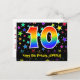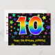 Framsidan av denna spännande, roliga och färgglada födelsedagsteman postkort design har en stor siffra "10" med ett regnbågsspektrum-gradering inspirerat mönster, tillsammans med meddelandet "Happy 10th Birthday," och en personlig mottagare namn. Framsidan har dessutom ett färgglatt och livfullt stjärnformigt bakgrundsmönster. Baksidan har ett anpassat födelsedagsgratulationsmeddelande, eller kanske kan rensas och lämnas tomt om ett meddelande ska skrivas för hand istället. Ett personligt födelsedagskort som detta kan vara ett roligt sätt att erkänna någon på deras tionde födelsedag. Postkort som detta kan också användas för att inbjuda gäster till en födelsedagsfest som hålls för någon som fyller 10 år.