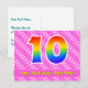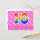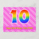 Framsidan av denna kärleksfulla, glada och lyckliga födelsedagsteman postkort visar ett stort nummer "10" med ett regnbågsspektrum-gradering-mönster. Den visar också meddelandet "Grattis på 10-årsdagen," och ett anpassningsbart mottagarnamn. Framsidan har dessutom ett glatt mörkt rosa och ljust rosa-randigt mönster med hjärtformer. Baksidan visar ett personligt födelsedagsgratulationsmeddelande, eller kanske kan rensas och lämnas tom om ett meddelande ska skrivas för hand istället. Ett personligt födelsedagskort som detta kan vara ett roligt sätt att fira någon på deras tionde födelsedag. Postkort som detta kan också användas för att inbjuda gäster till en födelsedagsfest som hålls för någon som fyller 10 år.