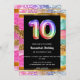 Ett ljust, färglöst och festivt födelsedagsfest inbjudan med regnbåge färg blandat med faux guld glitter, där ett svart överlägg med vita teckensnittsmallar visas för anpassningsbarnas ordalydelse. Siffran tio visas överst i en fetstilt och ljus regnbåge färg-blandning och ser ut att vara tredimensionell. Övertäckningens ovansida och grund kant har ett faux guld-vågrät-band som ge en chic och modern syn på detta fantastiska barns party-design.