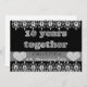 Skapa dina egna personliga, chic svarta tioårsjubileumsinbjudningar - På framsidan finns 3D-text som ser ut som grått borstat metall, tenn eller aluminium. Den lyder "10 år tillsammans". Över en genomskinlig remsa i svart, skuggad text står det "Du är inbjuden till en jubileumsfest". Falska diamantpärlhjärtan pryder varje ände. Övre och nedre kanterna är dekorerade med en diamantbård med filigranbroderi. Baksidan har svarta, 3D-utseende bokstäver för din anpassade, moderna 10-årsjubileumsfestinformation. Anpassa efter eget tycke. Besök vår Zazzle.com/angela65-butik för fler tioårsjubileumsfesttillbehör.