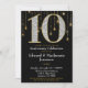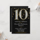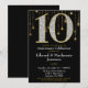 En elegant inbjudan till 10-årsjubileumsfest i svart och guld, med en stor 10 med diamanter och guldutseende tillsammans med en glittergardin av guld ljus.