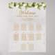 Det här wedding arrangemanget har 10 bord. Bakgrunden är vit marmor. Längs den övre kanten finns vita calla liljor och ormbunke. Namnen på bruden och brudgummen samt titeln Välkommen är skrivna med en elegant kalligrafisk stil . All text har en gyllene färg.