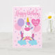 En hedervärd sitta på en regnbåge omgiven av ballonger och konetti. Kortets överkant har hand om ord "Grattis på födelsedagen", medan den hjärtformade ballongen har hand om ord "en i dag". Ett perfekt kort för en flickas tioårsdag!