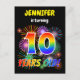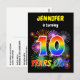 Födelsedagsfest inbjudan-vykortets framsida på ett livligt och roligt sätt har ett redigerbart namn, ett svidande berömvärt fyrverkerier inspirerade mönster och meddelandet "10 ÅRS OLD!" med ett färgstarkt regnbågsspektrum inspirerat till gradient mönster. Baksidan innehåller ett anpassade som kan innehålla information om födelsedagsfesten, till exempel när den sker och var den hålls. Sådana vykort kan skickas till potentiella gäster till en födelsedagsfest som hålls i firande på någons tioårsdag. [~Z0000452]