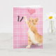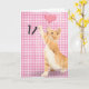 Guld tabby katt med rosa hjärtballong i elva år på rosa och vit gingham-bakgrund.