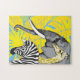 En elefant, en giraff och en zebra utgör grunden för detta safari-temat pussel. Hela pusslet var designat i skuggor av gult, grått, svart, vit och blå.