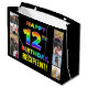 Denna glatta och uppseendeväckande presentsäck med hög födelsedagstäckning innehåller budskapet "LYCKLIG 12:E BIRTHDAY", där texten har en multifärgad med regnbågsspektrum som inspirerar övertoningen mönster, tillsammans med en personlig mottagare av namn. Till lämnat och högerna på det regnbågsmönstrade meddelandet på framsidan finns några foton som kan vara personliger, kanske med foton på mottagaren, mottagarens familj och vänner och/eller presentens avsändare. En dylik presentpåse för öga-infångande födelsedag kan vara ett roligt för att slå en present till någon som firar sin tolfte födelsedag. (Photography © Storytree Studios, Stanford, CA.) [~Z0000668]
