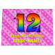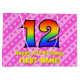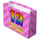 Den här presentsäcksdesignen i lycklig och roligt 12:e under födelsedagskalemat har ett stort nummer "12" med mönster inspirerad av ett regnbågsspektrum. Det innehåller också budskapet "Lycklig 12:e födelsedag" och ett anpassade namn. Bakgrunden är en glad mönster av mörkens rosa och ljust rosa rand som innehåller levande hjärtformer av rosa. Sådana presentsäckar kan användas när man slår in gåvor eller presenter ges till någon som firar sin tolfte födelsedag. [~Z0000414]