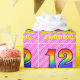 Denna glada och lycklig 12:e-födelsedagskalas pappra design har ett stort nummer "12" med en färgstark mönster inspirerad av ett regnbågsspektrum. Det innehåller också meddelandet "Lycklig 12:e födelsedag" och ett eget namn. Bakgrunden är en roligt mönster av mörkens rosa och ljust rosa rand som innehåller levande hjärtan från rosa. Att packa pappert som detta kan användas när man ge en gåva eller present till heder för någons födelsedag i 12:e. [~Z0000415]
