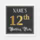 Den här ornitala och opulenta födelsedagstecknet papper napkindesign har en personlig namn och meddelandet "12:e Födelsedagsfest". Det stora antalet "12:e" har en imitation/faux-guld-inspirerad färgning av mönster, och ord "Födelsedagsfest" är i elegant text som skrivs stil. Bakgrunden är färgadens svarta som standard (även om den kan anpassas). Finare, elegant pappra blöjor av det här slaget kan vara bra att ha på en födelsedagsfest för att hedra någons tolfte födelsedag. [~Z0000565]