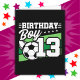 Den här födelsedagsfesten är perfekt för en 13-årig pojkes födelsedagsfest för fotboll att fira sin 13-årsdag! Underbar för barn att kärlek ska spela fotboll, titta på fotbollsspelare eller framtida fotbollsstjärnspelare! Har en fotboll på en fotbolls-fält-grafik med nummer 13 för en pojkes trettonde födelsedag.
