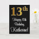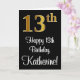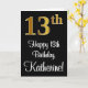 Denna stilrena, sofistikerade och lyxiga födelsedagsgratulationskortdesign har en stor ordinal siffra "13:e" med ett imiterat/faux guld-inspirerat övergångsmönster, tillsammans med födelsedagsgratulationsmeddelandet "Grattis på 13-årsdagen", och ett anpassat namn i en typsnitt i skrivstil på framsidan. Den har också en svart bakgrund på framsidan. Insidan har ett anpassat födelsedagsgratulationsmeddelande, eller kan eventuellt lämnas tom om ett meddelande ska skrivas för hand istället. Ett stilrent anpassningsbart födelsedagsgratulationskort som detta kan skickas för att fira någon som fyller tretton. [~Z0000518]