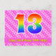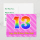 Framsidan av denna kärleksfulla, glada och lyckliga födelsedagstemanade postkort visar ett stort nummer "13" med ett regnbågsspektrum-gradering-mönster. Den visar också meddelandet "Grattis på 13-årsdagen," och ett redigerbart mottagarnamn. Framsidan har dessutom ett glatt mörkt rosa och ljust rosa-randigt mönster innehållande hjärformade figurer. Baksidan visar ett personligt födelsedags-hälsningsmeddelande, eller skulle kanske kunna rensas och lämnas tom om ett meddelande ska skrivas för hand istället. Ett personligt födelsedags-kort som detta kan vara ett roligt sätt att fira någon på deras trettonårsdag. Postkort som detta kan också användas för att inbjuda gäster till en födelsedagsfest som hålls för någon som
