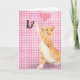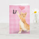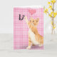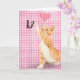 Guld tabby katt med rosa hjärtballong i 13 år på rosa och vit gingham-bakgrund.