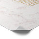Bröllopsplanen har 13 bord. I hörnen, uppe till vänster och nere till höger, finns blå agatgeoder. Bakgrunden är vit marmor. Brudens och brudgummens namn är skrivna med en elegant kalligrafisk skrift. All text har en gyllene färg.