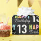 Rullar med lätt färgad papper med en svart bakgrund av en enkel typografi "Grattis på födelsedagen" med hjälp av block brev för LYCKLIG och ett avslappnad skript för Birthday. Numret 13 är dekorerat med färgstark polkprick konetti. En papper omslutning som du kan använda för vilken som helst.