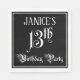 Den här lyxiga och utförliga födelsedagstexten med den pappra napkin-designen har ett redigerbart namn och meddelandet "13:e Födelsedagsfesten". Det stora talet "13:e" och ord "Födelsedagsfest" står i elegant manustext-stil. Bakgrunden är färgadens svarta som standard (även om den kan anpassas). Finare, elegant pappra blöjor av detta slag kan vara användbara vid en födelsedagsfest/firande som hålls för att hedra någons trettonde födelsedag. [~Z0000563]