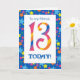 Ett ljust och färgstarkt 13:e födelsedagskort för en vän, med raka nummer och stjärnformat gräns, från en digital design av Judy Adamson. Du kan ändra det inre meddelandet om du vill.