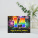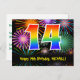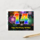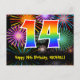 Framsidan av denna roliga, färgglada och spännande födelsedagskortdesign har en stor siffra "14" med ett regnbågsspektrum-gradering-mönster, tillsammans med meddelandet "Grattis på 14-årsdagen," och ett anpassat mottagarnamn. Framsidan har dessutom ett livfullt och färgglatt bakgrundsmönster inspirerat av sprängande festliga fyrverkerier. Baksidan har ett redigerbart födelsedagsmeddelande, eller kan raderas och lämnas tomt om ett meddelande ska skrivas för hand istället. Ett anpassningsbart födelsedagskort som detta kan vara ett roligt sätt att erkänna någon:s fjortonårsdag. Postkort som detta kan också användas för att inbjuda gäster till en födelsedagsfest eller firande som hålls för någon som fyll