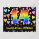 Framsidan av denna kärleksfulla, färgglada och roliga födelsedagskortdesign har en stor siffra "14" med ett regnbågsspektrum-gradering-mönster, tillsammans med meddelandet "Happy 14th Birthday," och ett anpassningsbart mottagarnamn. Framsidan har dessutom ett livfullt och färgglatt bakgrundsmönster med kärleksfulla hjärtan i olika storlekar. Baksidan har ett anpassat födelsedagsmeddelande, eller kanske kan rensas och lämnas tomt om ett meddelande ska skrivas för hand istället. Ett personligt födelsedagskort som detta kan vara ett roligt sätt att skicka ett meddelande för att fira någon:s fjortonde födelsedag. Postkort som detta kan också användas för att inbjuda gäster till en födelsedagsfest som hålls