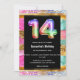 Ett ljust, färgstarkt och festivt födelsedagsfest inbjudan med regnbåge färger blandat med faux guld glitter på vilket en svart övertäckning med vita teckensnittsmallar visas för anpassningsbarnas ordalydelse. Numret fjorton visas överst i en fetstilt och skarp regnbågsblandning av färg och verkar vara tredimensionellt. Övertäckningens övre och grund kant har ett faux guld-vågrät-band som ge en chic och modern syn på detta fantastiska barns party design.