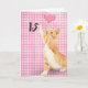 Guld tabby katt med rosa hjärtballong i 15 år på rosa och vit gingham-bakgrund.