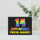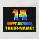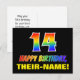 Framsidan av denna färgstarka, glada och roligt födelsedag med vykort har ett stort nummer "14" och budskapet "GRATTIS PÅ FÖDELSEDAGEN", som båda har en regnbågsspektrumövertoning som inspirerade mönster-färgning, tillsammans med en fet gult personlig mottagare namn. På framsidan finns också en svart bakgrund med oformaterad färgad. Baksidan av vykortet innehåller ett redigerbart födelsedagsmeddelande hälsning, eller så kan det kanske raderas och lämnas tomt om ett meddelande ska skrivas för hand i stället. Ett spännande vykort för anpassadets födelsedag som detta kan vara ett roligt sätt att erkänna någons fjortonårsdag. [~Z0000474]