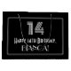 Stil 1920-talet/1930-talet i vintage ser inspirerad ut med presentsäcksdesignen på födelsedagskalan och har ett stort konsthugga som ser inspirerat nummer 14, Lycklig 14:e födelsedagen, ett anpassade namn och ett gräns mönster som består av tunt linjer. Bakgrunden är svart på färgad. En presentpåse som denna kan användas när man fyller i en födelsedagspresent eller gåva som ges till någon som firar sin fjortonde födelsedag. [~Z0000497]