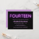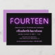 Coola modern 14:e födelsedagsfest inbjudan med "FOURTEEN" i lila, ljusnande neon ljus mot svart bakgrund.