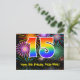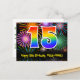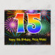 Framsidan av denna spännande, roliga och färgglada födelsedagstema postkortsdesign har en stor siffra "15" med ett regnbågsspektrum-gradering inspirerat mönster. Den har också meddelandet "Grattis på 15-årsdagen," och ett redigerbart mottagarnamn. Framsidan har dessutom ett färgglatt och livfullt bakgrundsmönster inspirerat av utseendet på sprängande festliga fyrverkerier. Baksidan har ett personligt födelsedagsmeddelande, eller skulle kunna rensas och lämnas tom om ett meddelande ska skrivas för hand istället. Ett personligt födelsedagskort som detta kan vara ett roligt sätt att uppmärksamma någon på deras 15-årsdag. Postkort som detta kan också användas för att inbjuda gäster till en födelsed