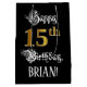 Den här utformandet och finare-presentsäcksdesignen innehåller budskapet "Lycklig 15:e födelsedagen" och ett anpassade som tar emot namn. En del av meddelandet finns i ett opulent skript-stil. Det stora antalet "15:e" har ett faux/imitation-inspirerat utseende mönster. Bakgrunden är svart på färgad. En dylik presentpåse på födelsedagen kan användas när en gåva eller present i firande på någons 15-årsdag är ge. [~Z0000560]