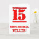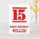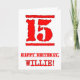 Den här roligtens hälsningskort med hälsningskort har ett stort rött nummer "15" som har ett gummiinspirerat utseende från frimärke, tillsammans med hälsning-födelsedagsmeddelandet "GRATTIS PÅ FÖDELSEDAGEN," och ett eget namn på framsidan. Insidan har ett hälsning-meddelande från anpassadets födelsedag, eller kan kanske rensas och lämnas tomt om ett meddelande ska skrivas för hand i stället. Ett roligt anpassat födelsedag av det här slaget kan skickas i firande på någons femtonårsdag. [~Z0000524]