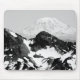 Ett svart och vitt foto av berget Rainier med ett hårt bergsområde i förgrunden. Upphovsrätt ©2023 Kimberly J Tilley. zazzle.com/store/developingnature