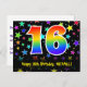 Framsidan av denna roliga, färgglada och spännande födelsedagskortdesign har en stor siffra "16" med ett regnbågsspektrum-gradering-mönster, tillsammans med meddelandet "Grattis på 16-årsdagen", och ett anpassningsbart mottagarnamn. Framsidan har dessutom ett livfullt och färgglatt stjärnformsmönster i bakgrunden. Baksidan har ett anpassat födelsedagsmeddelande, eller kan kanske rensas och lämnas tomt om ett meddelande ska skrivas för hand istället. Ett personligt födelsedagskort som detta kan vara ett roligt sätt att fira någon på deras sextonde födelsedag. Postkort som detta kan också användas för att inbjuda gäster till en födelsedagsfest som hålls för någon som fyller 16 år.