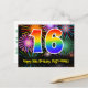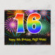 Framsidan av denna färgglada, roliga och spännande födelsedagskortdesign har en stor siffra "16" med ett regnbågsspektrum-gradering inspirerat mönster, tillsammans med meddelandet "Grattis på 16-årsdagen", och ett anpassningsbart mottagarnamn. Framsidan har dessutom ett livfullt och färgglatt fyrverkeri-inspirerat bakgrundsmönster som spricker ut i en explosion av färg. Baksidan har ett anpassat födelsedagsmeddelande, eller kan kanske rensas och lämnas tomt om ett meddelande ska skrivas för hand istället. Ett personligt födelsedagskort som detta kan vara ett roligt sätt att skicka ett meddelande för att fira någon:s sextonde födelsedag. Postkort som detta kan också användas för att bjuda in gäster till en