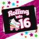 Denna skridskofestdesign är perfekt för en rullskridskofest eller födelsedagstema för en 16-årig flicka. Om födelsedagsflickan älskar att rullskridsko kommer hon att ÄLSKA denna skridskofestdesign! Funktioner retro stil 'Rullar in i 16' födelsedagscitat med cool rullskridskografisk med regnbågar & stjärnor som är roligt & unikt. Rolig rullskridskofestdesign för en flickas 16-årsdag!