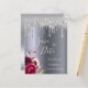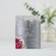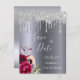 A Spara datumet för en svensk 16:e födelsedagsfest. En mörk faux silver metallic tittar bakgrund. Dekorerad med mörkens lila och blommor från burgundy och ro rosa, faux glitter droppning, färgdropputseende. Mallar för namn och datum. Texten: Spara datumet är skrivet med ett stort, modernt, handskript i stil. Tips! Om du inte vill att det ska se ut som ett vykort klickar du på anpassa, går till baksidan och tar bort delaren och lägger till frimärke.