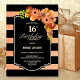 Svart och faux glitter-blommigt, strimlad 16-årsmiddagsinbjudan.