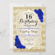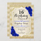 16:e födelsedagsinbjudan. Elegantens utformning i guld och royalets blå. Funktioner faux glitter guld rand, sapphire ro snyggt script och confietti. Perfekt för en glam-födelsedagsfest.