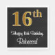 Den här sofistikerade pappra napkindesignen för snyggt och elegant har ett stort ordnummer "16:e" med en imitation/faux guld-liknande gradient mönster, plus hälsning-födelsedagsmeddelandet "Lycklig 16:e födelsedag" och ett anpassade namn i ett skript-stil teckensnitt. Den har också en bakgrund med svart färgad. Pappra servetter av detta slag kan användas när man firar någons sextonårsdag. [~Z0000516]